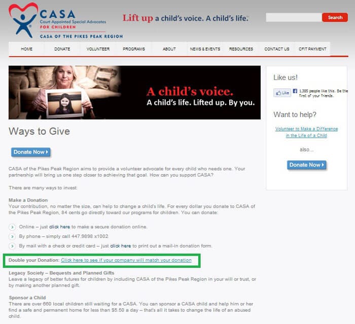 The Pikes Peak Region chapter of CASA offers a great example of promoting matching gifts on a “Ways to Give” page. Not only do they let donors know that they can give in multiple ways (including online, over the phone, and by direct mail), they also add information about matching gifts to encourage donors to look into their employers’ own programs.