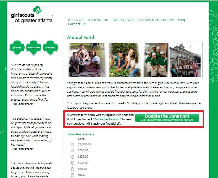 Follow the lead of the Girl Scouts of Greater Atlanta. They’ve included matching gift information in the center of their donation page to remind donors that they might be able to double their contributions. They also provide donors with different giving levels as well as information about what their donations help accomplish.