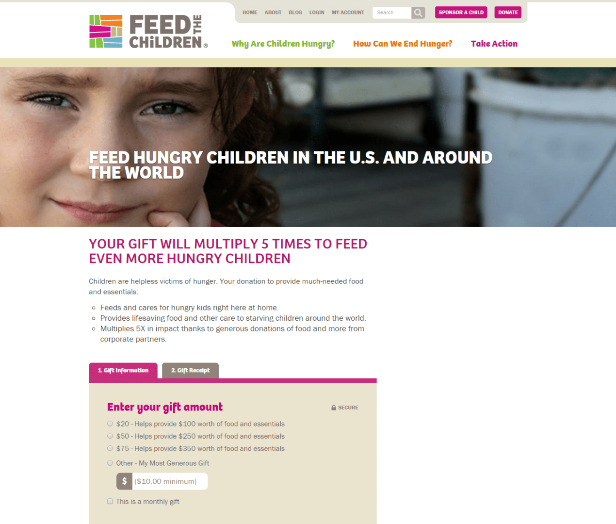 - Donation amounts, monthly option, and gift designation offered in a clear, and efficient manner
