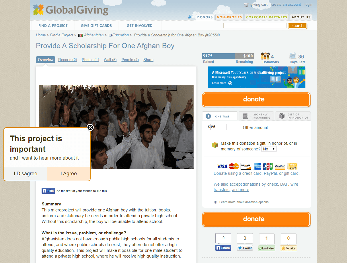 - At first glance, the Global Giving site and donation page may seem overwhelming. However, this site is perfect for donors looking for a nonprofit/cause to support but that want to compare/choose what or who they would like to donate to.